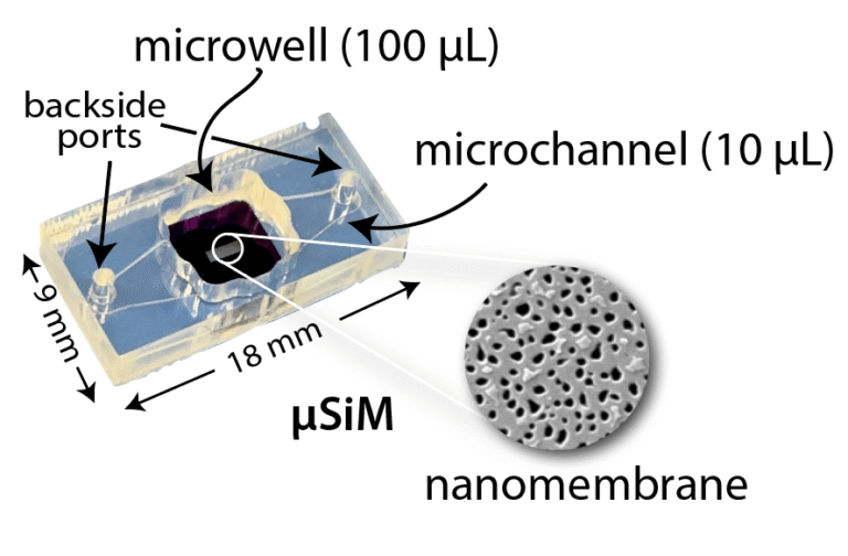 The µSiM (microphysiological system featuring a Silicon Membrane) tissue chip platform1 is ideally suited for the design and construction of MPS systems focused on the role of barrier functions in physiology and disease. The enabling feature of the µSiM is an ultrathin membrane (< 100 nm thick) with abundant pores that can be tuned in size from 40 nm to tens-of-microns2-5. We have also engineered versions with mixed micropores and nanopores to enable cell trafficking and cell-cell contact across the membranes1,6,7. Because of their ultrathin nature and high porosity (1010 nanopores / cm2), ‘nanomembranes’ offer no measurable resistance to the diffusion of molecules smaller than pores1,8,9. In this way paracrine factors and other small molecules move freely between tissue compartments with rates controlled by cellular processes and cell/matrix barriers1. More than 3 times thinner than the wavelength of visible light, the membranes enable glass-like imaging by phase contrast microscopy10,11 and are undetectable in basement membranes formed by co-cultures on either side of the membrane12. The membranes are made of silicon nitride, an inert material that adsorbs protein coatings to promote cell adhesion, but is incapable of absorbing biomolecules or organic compounds, as seen with PDMS. While silicon nitride has a high modulus, the nanomembranes are so thin that they are flexible: they deflect under pressure13 and spontaneously wrinkle when free of their silicon support4,14.