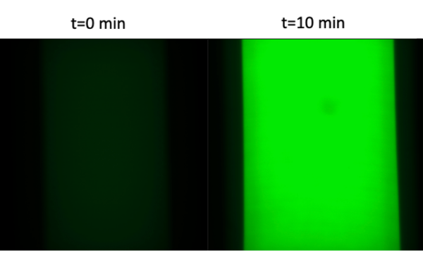 - Let it run 10 min. You will see dye entering the bottom channel over time.