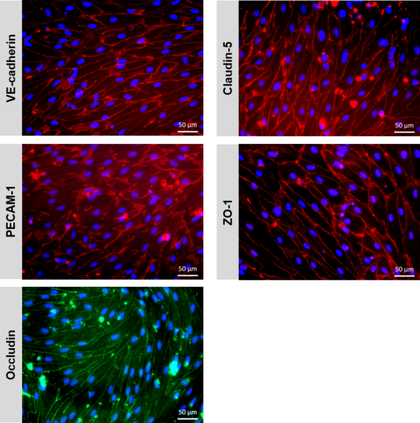 Figure 1: Immunofluorescence staining of junctional proteins on EECM-BMEC-like cells cultivated onto nanomembrane.