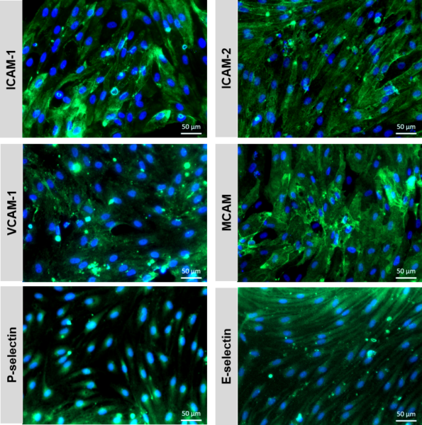 Figure 2: Immunofluorescence staining of adhesion molecules on EECM-BMEC-like cells cultivated onto nanomembrane. *For the stainings of ICAM-1, VCAM-1, and P-selectin cells were pre-stimulated with 0.1 ng/mL TNF‐α + 2 IU/mL IFN‐γ.