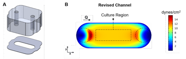 Figure 1. A. Manufactured flow insert, with a molded PDMS top layer and PSA/PET/PSA channel. B. Shortened channel dimensions maintain uniform shear stress at the culture surface.