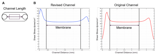 The shear stress values at the culture surface across the length of the membrane were calculated to be 10.661 dynes/cm2 for the revised channel and 10.657 dynes/cm2 for the original channel at a flow rate of 580 µl/min (Figure 2).