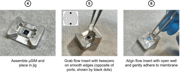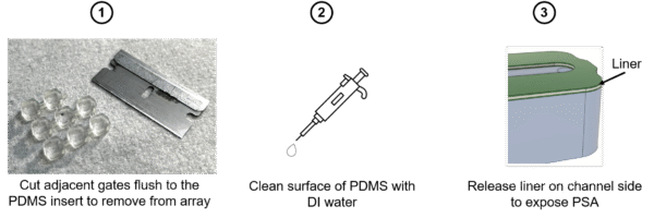 ALine performed a leakage test and found that the PSA provides a tight seal, preventing leakage from the channel (Figure 4). In-house testing confirmed alignment of the insert with the open well of component 1 as well as a tight seal between the PSA layer and the membrane surface.