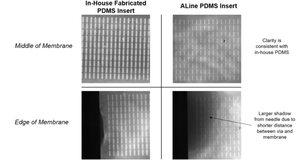 Figure 5. Phase images taken at 10x in a microslit membrane device, showing comparable optical clarity between the in-house and ALine PDMS.