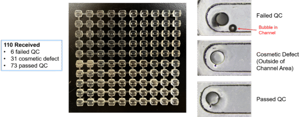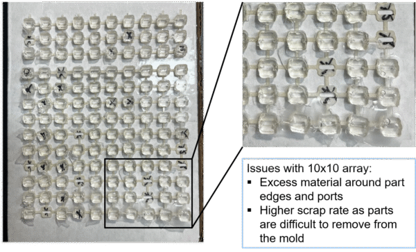 Since the port issue was a straightforward fix, we proceeded with efforts to scale up the production process. Up until this point, ALine was producing the inserts in 3×3 arrays. To drive costs down to a reasonable unit price, we needed to fabricate a larger array. ALine created a similar mold as before but as a 10×10. The resulting components are shown in Figure 11. While the flow ports were the correct diameter and peel-and-stick functionality worked well, the overall scrap rate was too high. Many of the parts that passed QC still had excess material around the edges of the part and ports, making it difficult to reliably pipette through the channel. It was clear that this method would not yield reproducible parts on a large scale.