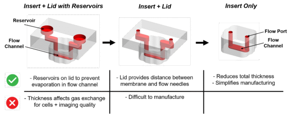 As detailed in Figure 1 below, our initial designs for a manufactured flow insert included complex geometries and a larger overall device thickness, which we deemed too complex for high-throughput manufacturing methods.