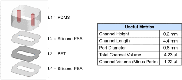The final flow insert design for manufacturing includes a 3 mm thick PDMS part with flow ports connected to a 200 μm tall flow channel. This flow channel has a pressure-sensitive adhesive (PSA) on the bottom to enable peel-and-stick capabilities.