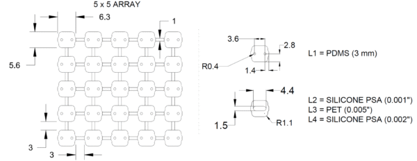 To improve the efficiency of the manufacturing process, the components are molded in a 5×5 array and laminated with the PSA/PET/PSA as an array. The schematic of the 5×5 array and key dimensions are indicated in Figure 5 below.