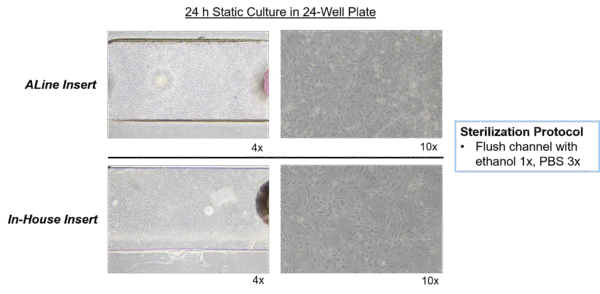 In addition, we observed poor cell growth after 24 hours of static culture. I investigated the potential source of toxicity by placing the inserts in a 24-well plate and culturing HUVECs for 24 hours. As shown in Figure 7, the cells appeared viable in both the ALine manufactured inserts as well as the in-house fabricated inserts. I reasoned that this may be due to the sterilization protocol that I used with the initial devices that resulted in cell death. I had rinsed the inserts with ethanol and then put them under UV for 15 minutes before proceeding with seeding. For this well plate experiment, I rinsed with ethanol but then rinsed 3 times with PBS before seeding. In the previous experiment, there may have been trace amounts of ethanol present in the inserts leading to a loss of viability. Thus the PBS washes are necessary to avoid these problems in the future.