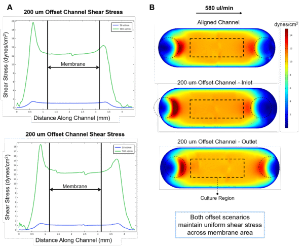 Figure 15. Comparison of shear stress profiles on channel surface with max offset either on the inlet or outlet side of the channel. A. Quantitative shear stress values at low and high flow rates. B. Shear stress maps of aligned channel, inlet offset, and outlet offset.