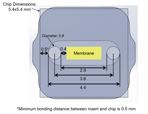 ALine follows specified design constraints to reduce risk throughout the manufacturing process. They prefer 1 mm of edge-to-edge spacing between features. Given that we were limited by the membrane dimensions, we established the channel length at 4.4 mm, thus pushing the edge-to-edge spacing recommendation by 0.5 mm. As shown in Figure 2, there is 0.5 mm of bonding space between the membrane and the right/left edges of the flow insert.