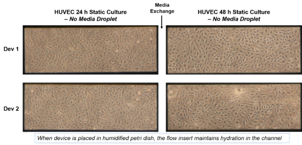 Since the flow channel volume is so small (~2 ul), it was standard practice to add a droplet of media on top of the insert during static culture to prevent the channel from drying out. I recently tested devices without including a droplet of media (but still including a moistened kim wipe in the petri dish) and found no significant effect on cell moropholgy after 24 hours of static culture.