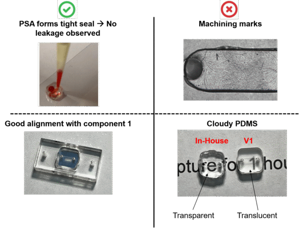 A previous post detailed the validation tests for the V1 manufactured flow inserts. In summary, this first round of prototypes looked promising in regards to a leak-proof seal and alignment with component 1. However, the major concerns included cell death after 24 hours of initial static culture, cloudy PDMS, as well as surface roughness that affected image quality.
