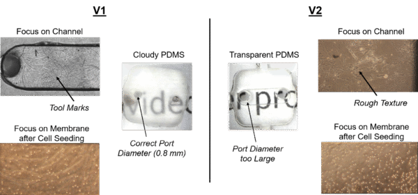 While the imaging clarity was improved and machining marks reduced, the V2 flow inserts ports appeared larger than the specified 0.8 mm diameter. With the new molding procedure, the ALine engineers decided to re-punch the ports after removing the PDMS from the mold to ensure that a complete via was formed. However, this caused the port diameters to be larger than 0.8 mm.