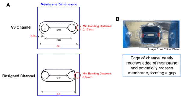 Figure 14. A. V3 channel length compared to original design channel length. B. Image of device with V3 insert demonstrating lack of bonding area at edges of insert.