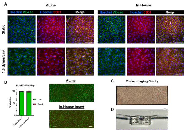 Figure 13. A. VE-cadherin and CD31 junctional stains for HUVEC cultured for 72 hours of static culture or fluidic culture at 1.5 dynes/cm2 (Scale bar = 100 μm. B. Live/Dead stain of HUVEC cultured for 24 hours either in ALine manufactured flow insert or in-house insert, demonstrating comparable cell viability. C. Phase imaging clarity of HUVEC cultured in manufactured flow insert. D. Assembled fluidic device with flow tubing.