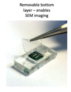 After teaming up with ALine, experts in microfluidic device production, the second generation of µSiM devices were developed. This generation was designed for mass production and high-throughput analysis, retaining the “Transwell”-style layout. Devices transitioned from PDMS to acrylic-based to avoid the concerns associated with PDMS, such as absorption of small hydrophobic molecules. Devices were manufactured by ALine and shipped back to our laboratory for use or distribution. They feature a peel-off bottom layer to enable SEM imaging of the underside of the membrane. Thus far, this generation of devices has been used study osteomyelitis and to develop a novel in situ small molecule permeability assay on a microvascular mimetic.